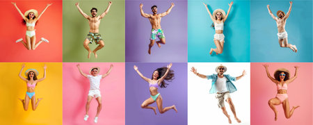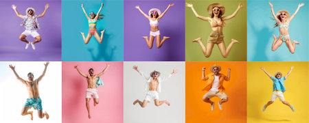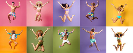 Summer people collection set, diverse people jumping on colorful background, many people funny jump wearing summer outfit fashion ready for swim and summer activity, summertime, beachwear AIG48