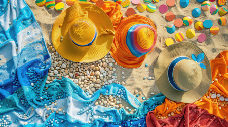 An electric blue hat, patterned scarf, stylish sunglasses, and a rainbow towel are laid out on the beach. The colors create a beautiful circle of art amidst the sand and water AIG50