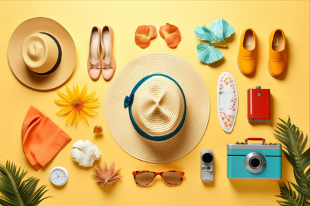 Summer vacation concept, travel. Beach accessories and stuff on a yellow background. Studio shot. Flat lay