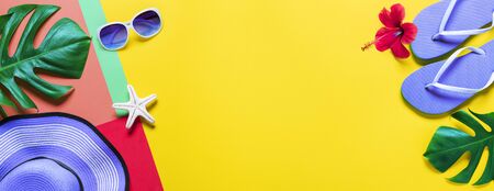Summer holiday vacation beach accessories flat lay top view with copy space