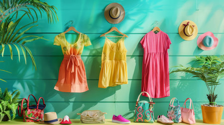 A vibrant display of summer clothing and accessories, featuring hats and dresses against a striking turquoise backdrop.