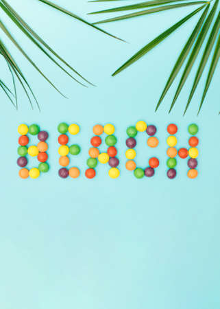 Beach word made from colored balls and palm leaves on a blue background. Tropical summer beach concept on a minimal background.