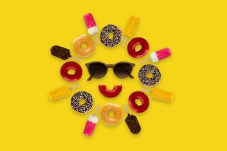 Sunglasses and half bited red donut set as smiling face surrounding with ice cream and donut that set as the sun on yellow background for minimal and summer concept.