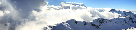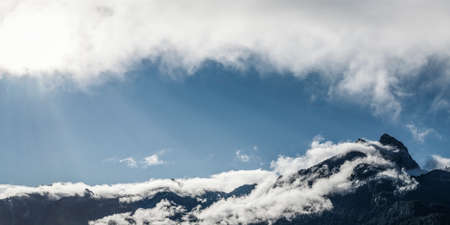 Beautiful mountain landscape with clouds and sun. Panoramic view.