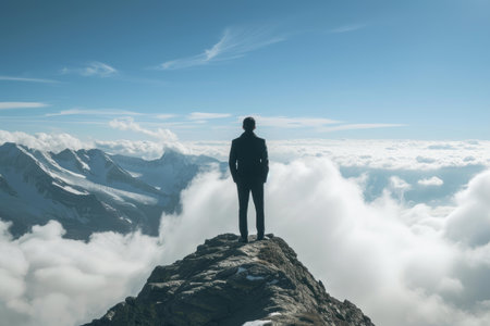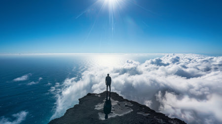 Solitary figure stands atop a peak, overlooking a sea of clouds under a blue sky