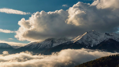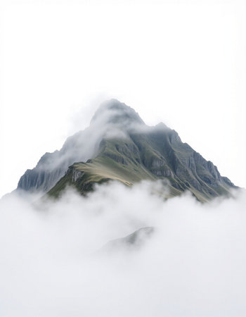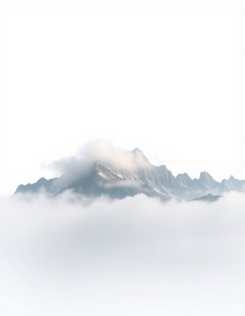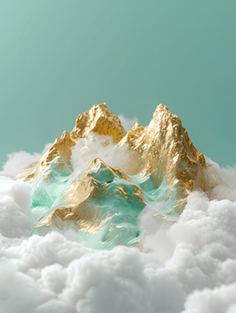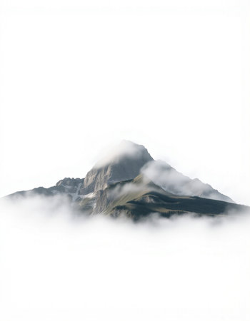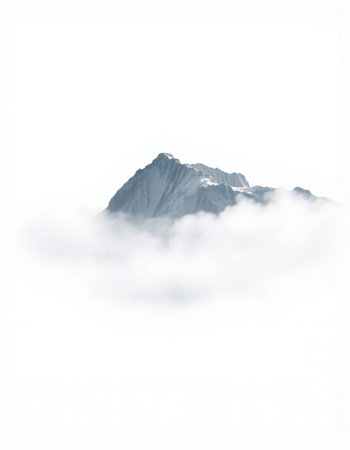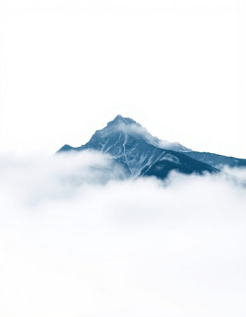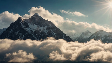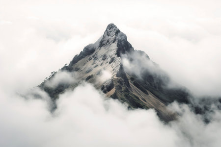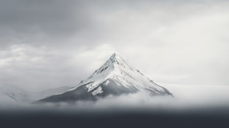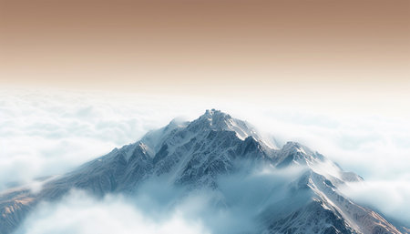 An AI generated illustration of a stunning mountain peak covered in the clouds