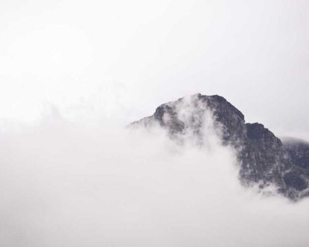 Mountain peak in white clouds, beautiful landscape of Pico Ruivo trekking path in Madeira island, scenic cloudscape view on mountains
