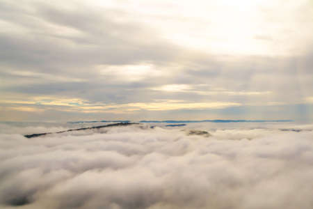 View at sunrise with puffy foggy. White puffy like cloud stretching to foggy horizon in the bright morning.