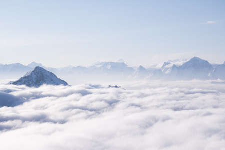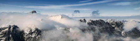 Wonderful alpine scenery with great rocks and mountains in dense low clouds. Atmospheric highlands landscape with mountain tops above clouds. Beautiful view to snow mountain peaks over thick clouds.