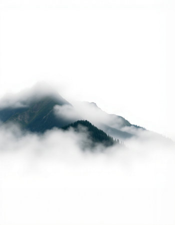 Mountain landscape with fog and clouds on a white background. Copy space.