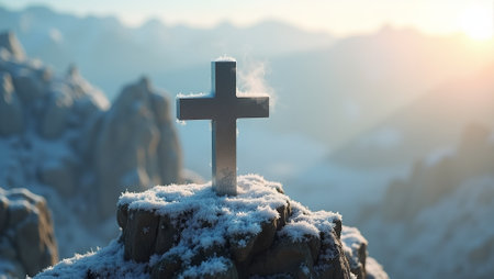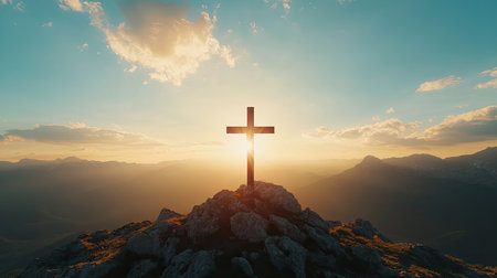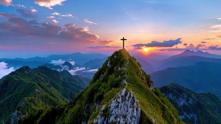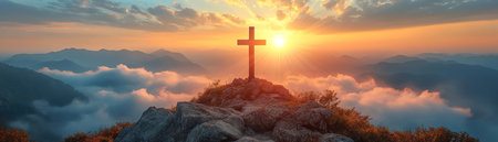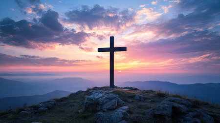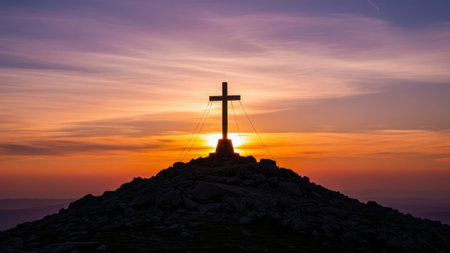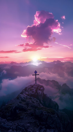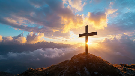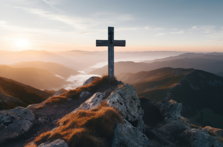 A large cross stands atop a mountain peak with a stunning sunrise backdrop, symbolizing faith and spirituality in natures beauty. The serene scene captures peaceful reflection.