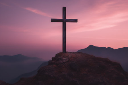Weathered stone cross standing on a rocky mountain peak at dawn. vibrant pastel sky illuminates the misty distant mountains, symbolizing faith, hope, and spiritual journey.