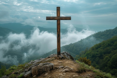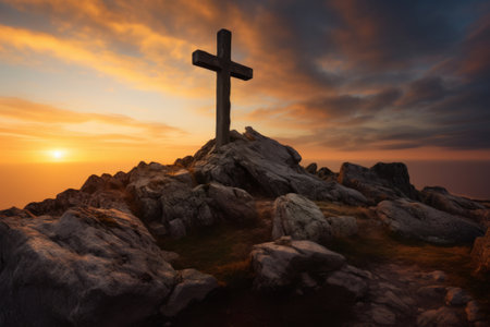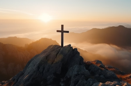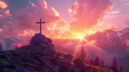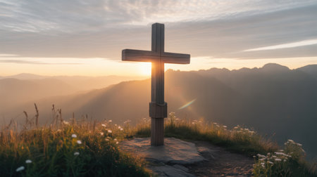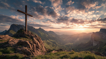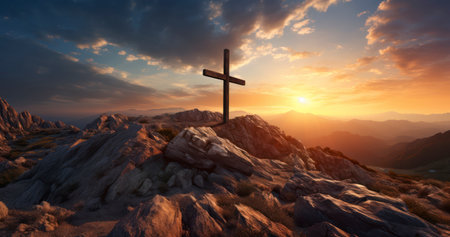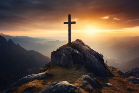Concept photo of a mountain range, with a large wooden crucifix standing tall against the dramatic sunrise, reminding us of the enduring strength and majesty of the cross