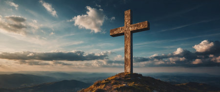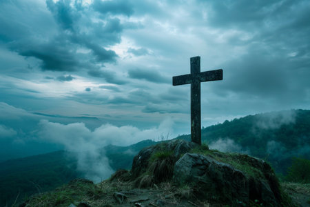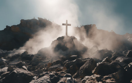 This evocative image of the Holy Cross on Golgotha symbolizes the death and resurrection of Jesus Christ, with a dramatic sky inspiring awe, redemption, and spiritual devotion central to
