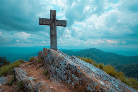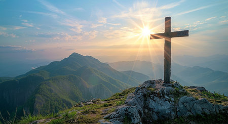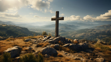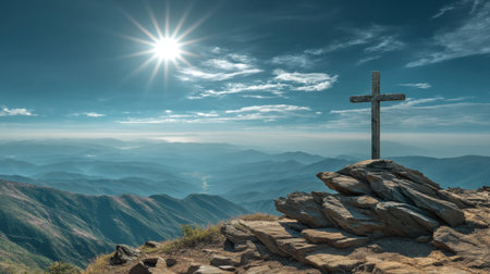 Serene landscape featuring wooden cross atop rocky outcrop, overlooking vast mountain range under bright sun. scene evokes sense of peace and spirituality, with soft clouds scattered across sky