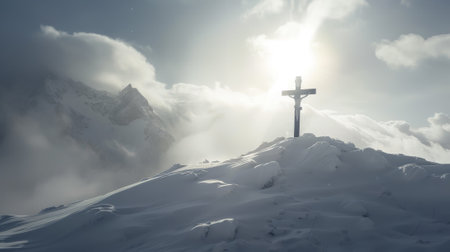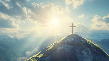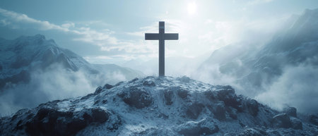A cross atop a misty mountain, with sun rays piercing through clouds, creating a heavenly atmosphere
