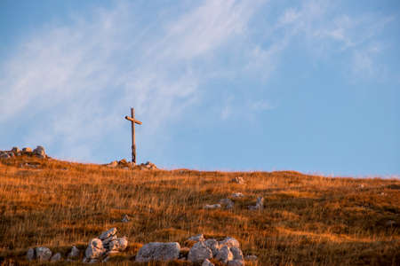 Religious Cross on the mountain at sunset. Landscape with flowers and a cross.