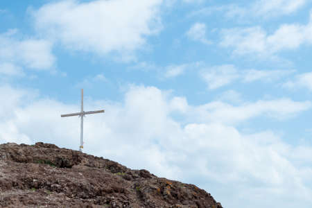 Cross on Rugged Summit with Blue Sky and Fluffy White Clouds