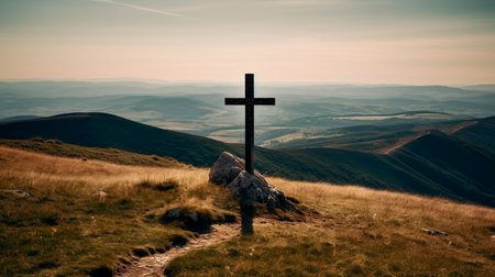 Christian catholic cross on the hills. Generative AI illustrator
