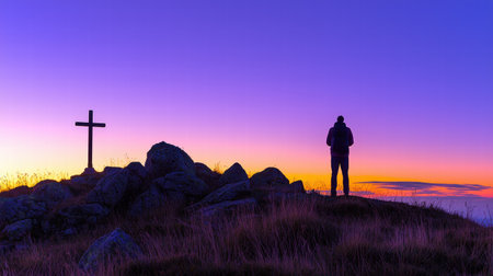 A lone cross silhouetted against a breathtaking sunset, with purple hues reflecting off the clouds and enveloping mountain mists
