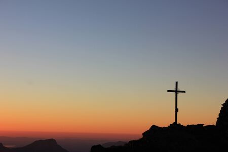 Cross on the top of the mountain with beautiful sunrise in the background