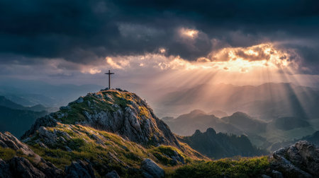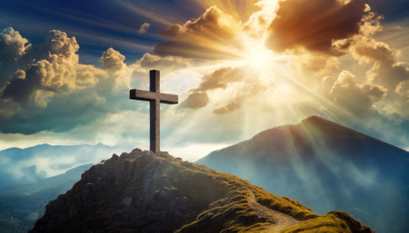 Cross on mountain peak silhouetted against vibrant sunset, with rays of light streaming through clouds, creating serene and spiritual atmosphere