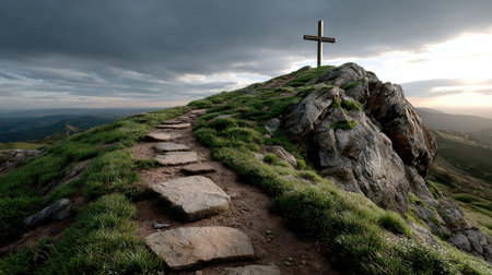 A stunning mountain pathway leads to a solitary cross atop a rocky hill, surrounded by lush greenery and dramatic clouds, offering a tranquil scene.