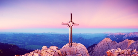 Cross with semi-precious stone raised at mountain summit in Alps. Sharp peak. Daybreak Sun in sky. Steel crucifix in memory of victims of mountains. Vivid photo.
