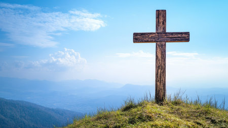 A rustic wooden cross is prominently featured on a grassy hill, set against a stunning blue sky, evoking feelings of peace, hope, and spiritual reflection in nature.