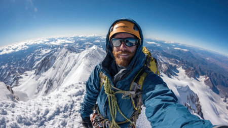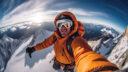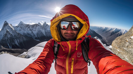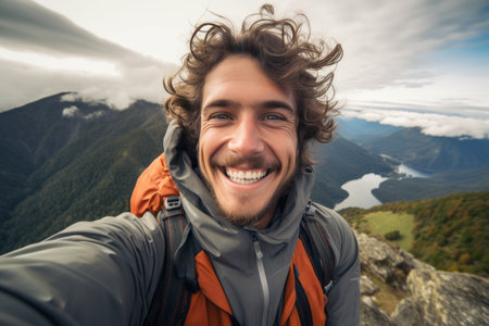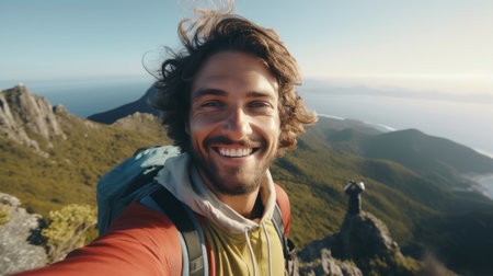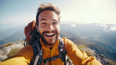 Generative AI : Young hiker man taking selfie portrait on the top of mountain Happy guy smiling at camera Hiking sport travel and technology concept Bright filter