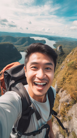 Happy Asian hiker man taking selfie portrait on the top of mountain, vertical format