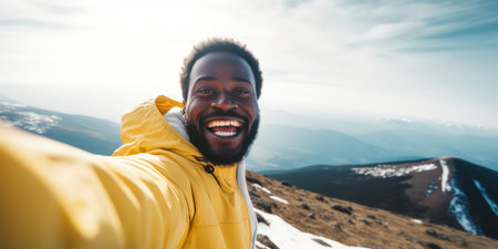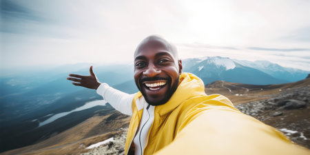 African hiker man taking selfie portrait on the top of mountain, Happy guy smiling at camera, Tourism, sport life style and social media influencer.