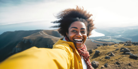 African hiker woman taking selfie portrait on the top of mountain, Happy woman smiling at camera, Tourism, sport life style and social media influencer.