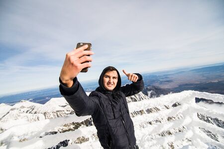 Young man take selfie in Winter in High Tatras Mountains. High Tatry. Slovakia. Vysoke Tatry.