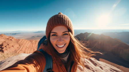 Capturing Memories: A Young, Beautiful Hiker Woman's Selfie Portrait on the Trail of Wanderlust