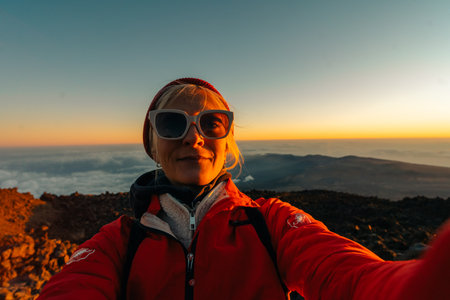 A traveler takes a sunrise selfie on Mount Teide. national park El Teide, Tenerife, Canary Islands, Spain. High quality photo