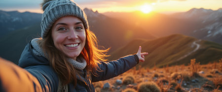 A woman in a warm jacket and beanie taking a selfie at sunset while hiking in the mountains.