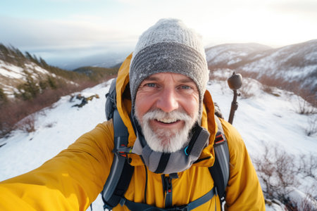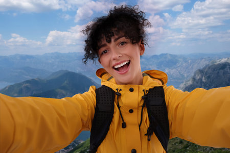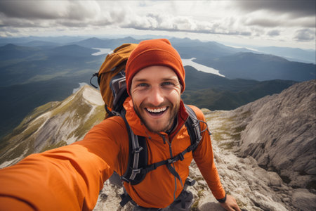 Smiling hiker taking a selfie on mountain peak, celebrating adventure, freedom, travel lifestyle, outdoor success, and breathtaking panoramic nature views.