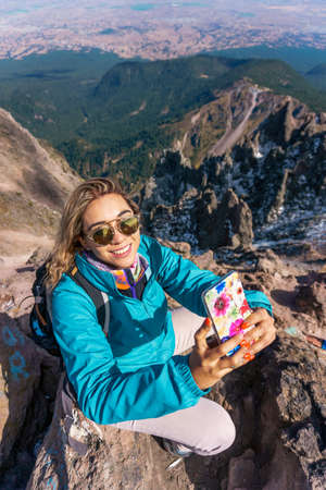 Handsome hiker taking a selfie hiking a mountain using his smartphone