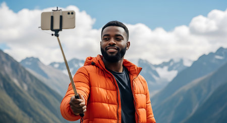 A man with a beard is standing outdoors in a mountainous landscape, taking a selfie with a smartphone attached to a selfie stick. He is wearing an orange jacket over a black shirt and is smiling at the camera. The background mountains with snow-capped peaks, a clear blue sky with fluffy white clouds, and lush green valleys. The scene conveys a sense of adventure, relaxation, and enjoyment of nature.