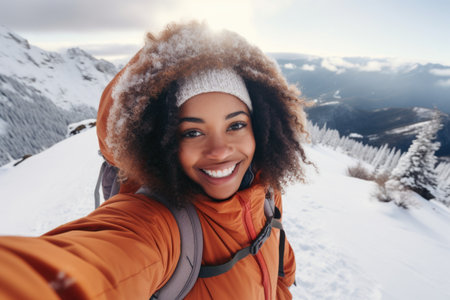 Happy woman posing for winter selfie on a ski resort. Sport and healthy lifestyle concept. AI Generated