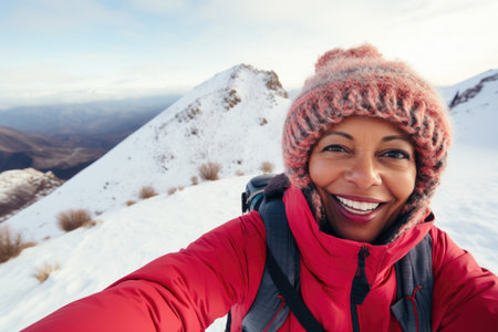 Smiling woman in a red beanie taking a selfie on a mountain summit, overlooking a vast valley with a winding river and snow capped peaks under a cloudy sky. adventure and travel concept.