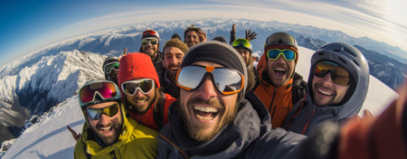 Self Portrait of Team of Mountain Climbers smiling and happy