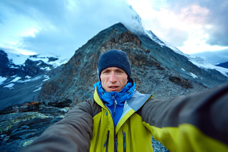 Young hiker man taking selfie portrait on the top of mountain, Happy guy smiling at camera, Hiking, sport, travel and technology.