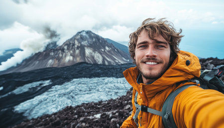 Young hiker is taking a selfie while smiling with an active volcano in the background