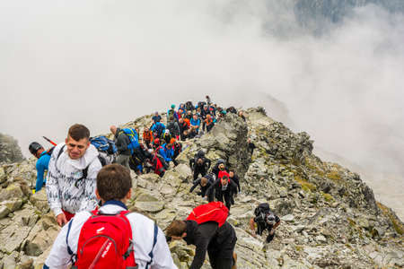 Palenica Bialczanska, Poland - September 08, 2018: Many tourists on the way to the popular Rysy peak. Tatra Mountains.