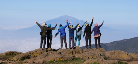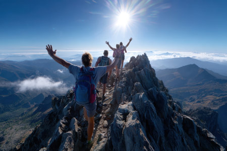 Group of hikers joyfully celebrating at the mountain peak during midday with expansive views around.