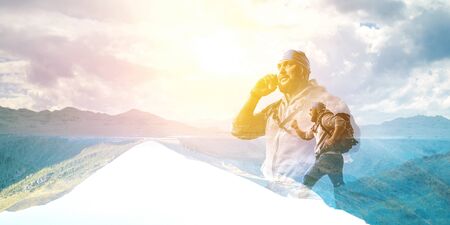 Hiker man in mountains. Mixed media