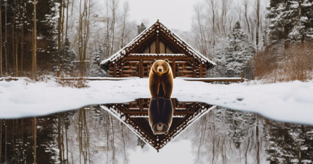 An AI generated illustration of A majestic brown bear stands in its natural winter habitat surrounded by snow-capped mountains