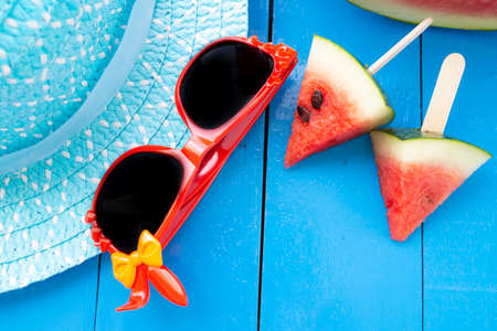 Summer hat with sunglasses and watermelon, starfish and plumeria flower on blue background. Summer background concept